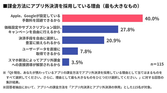 - アプリ外決済を採用している最も大きな理由は「手数料を回避できるから」が40%で最多