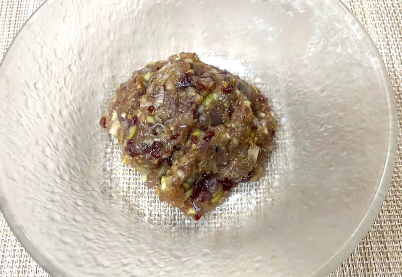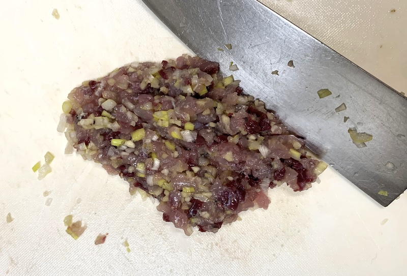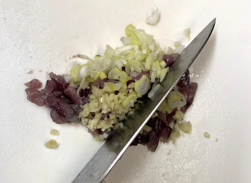 生姜、ネギ、ニンニク(ニンニクを入れるのが激ウマポイントみたいです)をみじん切りにし、細切りにしたオアカムロの刺身と合わせて叩き、味噌を入れて混ぜ合わせます。