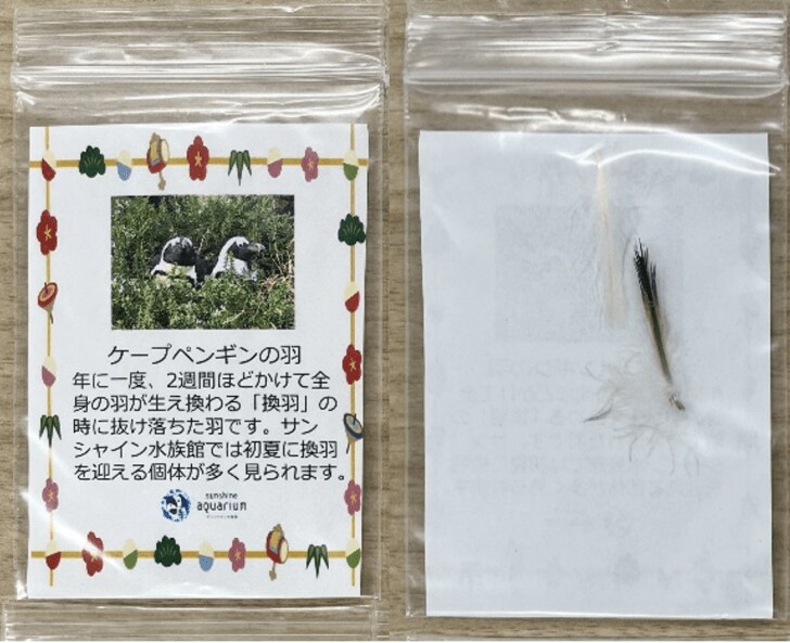 期間中、普段見ることのできないバックヤードを飼育スタッフが案内する探検ガイドツアーに参加した来館者全員に、サンシャイン水族館から落とし(お年)玉をプレゼント。中に入っているのは当館のケープペンギンたちが生え換わりで“落とした”ペンギンの羽。ペンギンはペアになると一生添い遂げると言われており、「夫婦円満のお守り」代わりになるかもしれない。