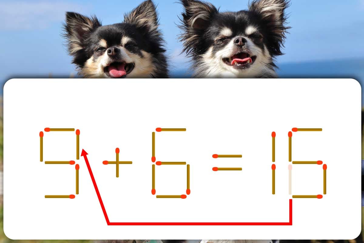 まず、答えの「16」から、「6」の左下にある縦のマッチ棒を取り、数字を「15」にしましょう。次に、左にある「5」の右上にマッチ棒を足し「9」にすると…見事「9+6=15」になり、式が成立しましたね♪