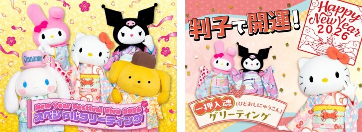 さらに、着物姿のサンリオキャラクターたちに会える「スペシャルグリーティング」や、新年を記念した色紙に、開運を祈願して、キャラクターに判子を押してもらえる「一押入魂グリーティング」、 1月4日(日)には午年を記念してターフィーもグリーティングに登場するなど、キャラクターたちとの年末年始の特別なひとときを楽しめる。