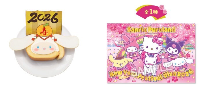 イベント限定のオリジナルグッズやフードも販売。2026年の干支である「午(うま)」にちなんだイベントビジュアルを使ったクリアファイル、パタパタメモが登場。1月1日(木)からは、イベント期間限定の「2026シナモロールのスフレロールケーキ」が登場する。