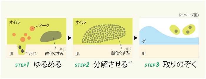 ハトムギオイルやコメヌカオイルなどが、古い角質や酸化皮脂へ「ゆるめる」「分解※4」「取りのぞく」の3ステップでアプローチします。