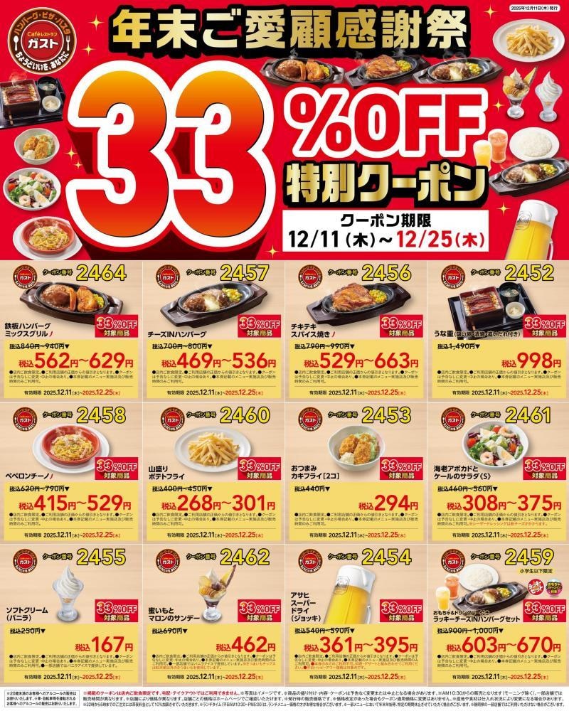 ガスト公式Xで、2025年12月11日から25日までの期間に使える33%オフクーポンが公開されています。