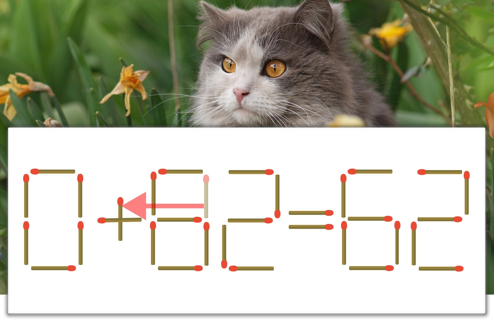 「8」を別の数字に変化させると答えが導き出せます。「8」のマッチ棒を1本移動して、「-」を「+」にしてみましょう。すると、「0+62=62」が成立します。