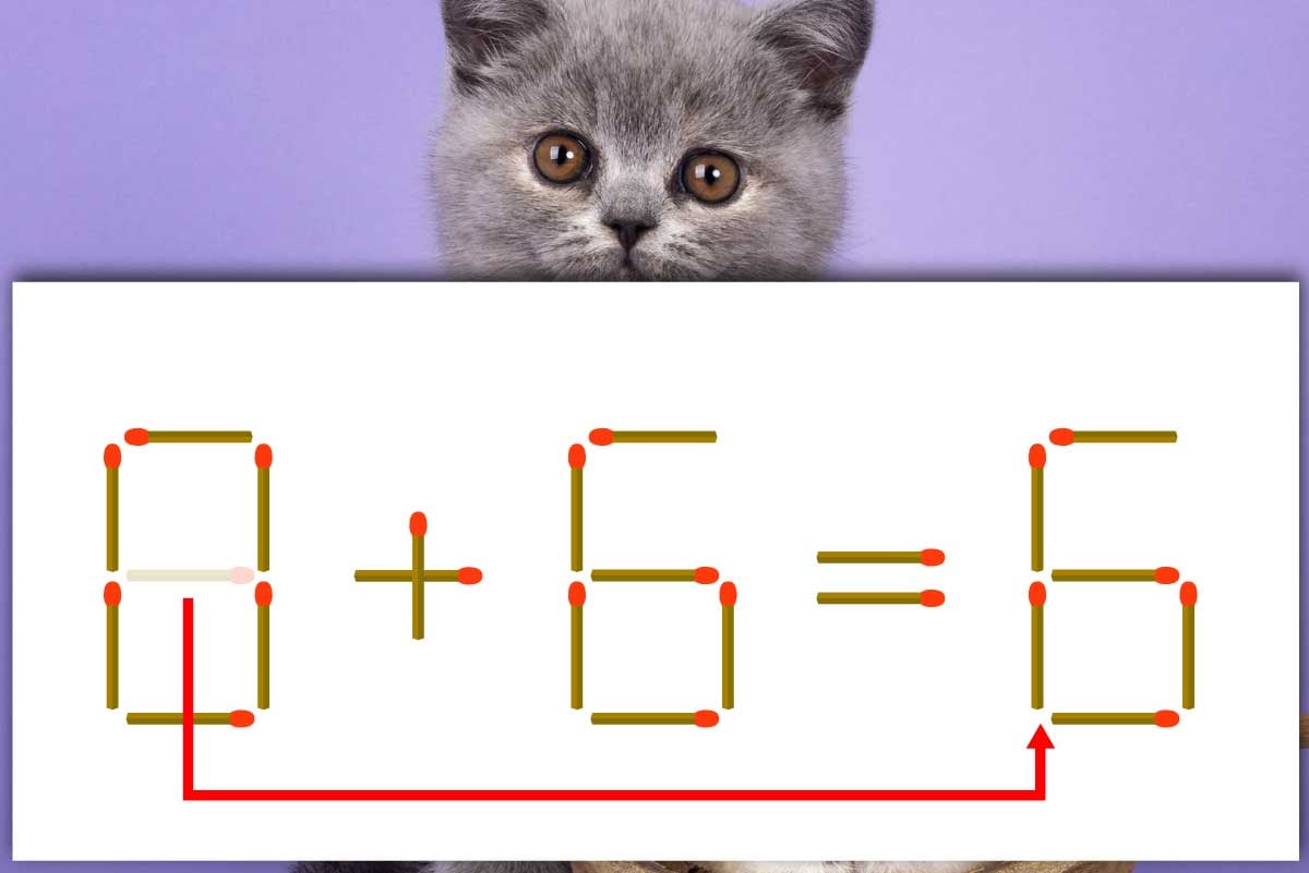 「8」の真ん中にある横向きのマッチ棒を抜き、「5」の左下につけて「6」にします。これにより「8」が「0」に変化し、「0+6=6」の式が完成しました!