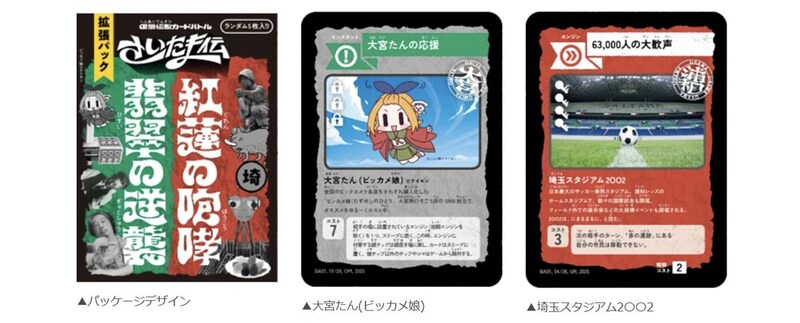 拡張パックには新カード20種を収録。浦和側は「タケカワユキヒデ」、「彩果の宝石」、「埼玉スタジアム2002」、「須原屋」などの10種、大宮側は「日高屋」、「鉄道博物館」、「大宮たん(ビッカメ娘)」、「ガスワンの川本会長」などの10種となっている。新効果として「自分のターンを2回連続で出来る」や「相手カード無効化する」などが追加され、戦略性が大幅に向上する。