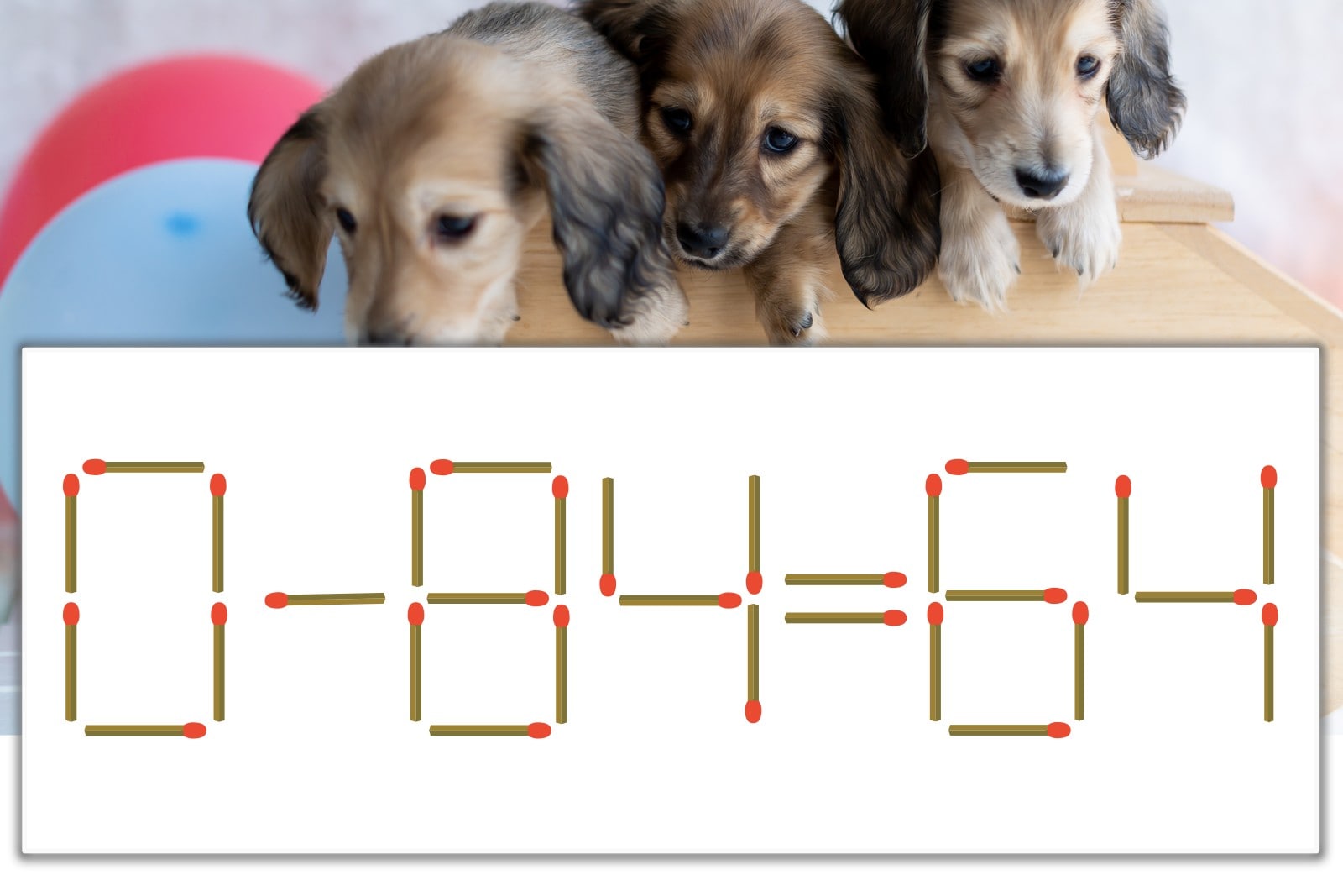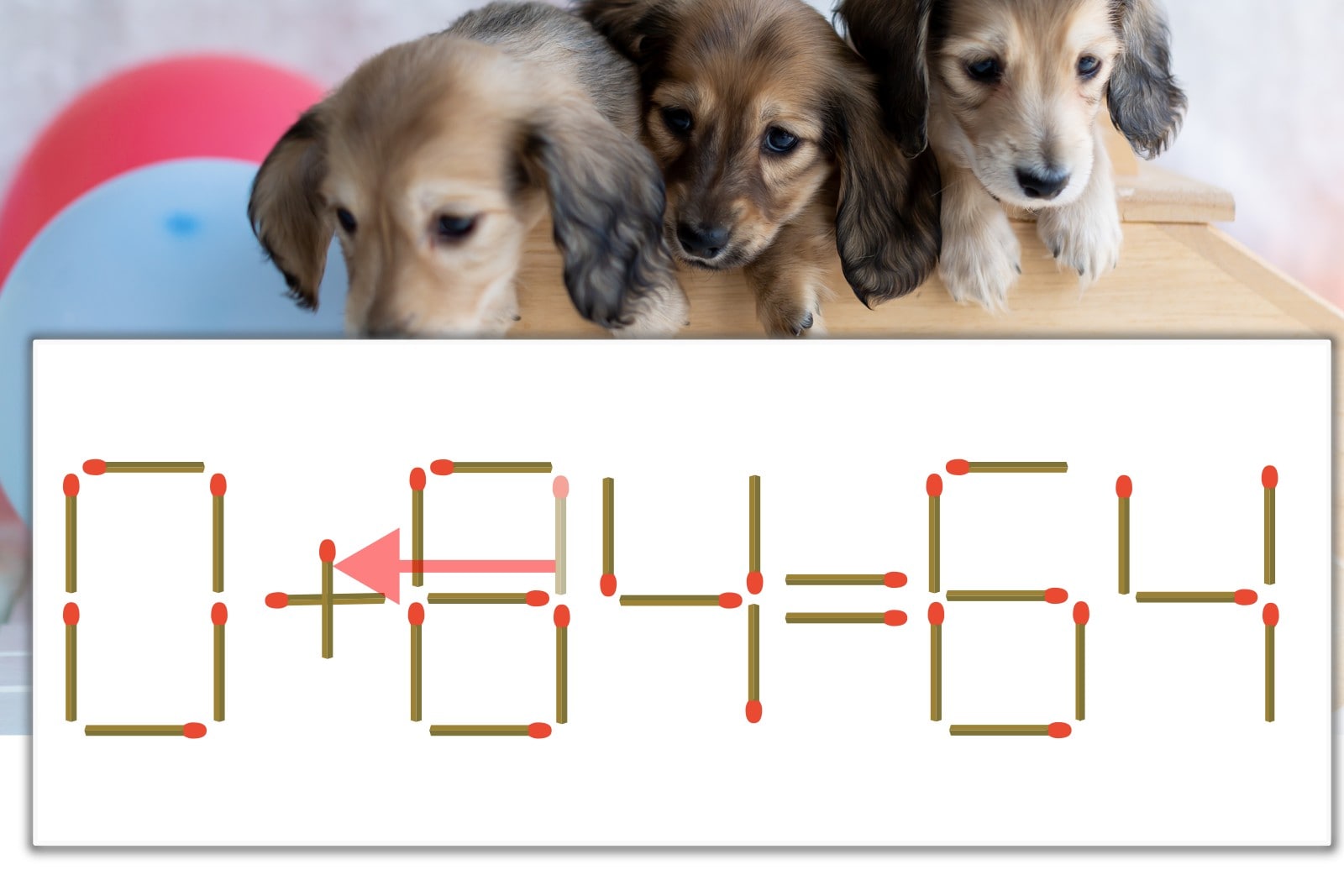 「8」を別の数字に変化させると答えが導き出せます。「8」のマッチ棒を1本移動して、「-」を「+」にしてみましょう。すると、「0+64=64」が成立します。