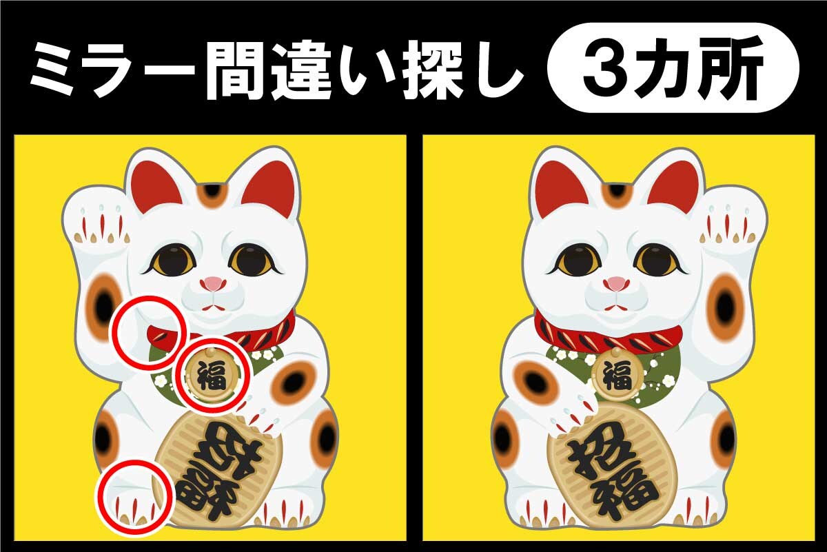 3カ所の違いは、1.首輪の模様、2.首輪の「福」の文字がミラーになっていない、3.足の爪の数
