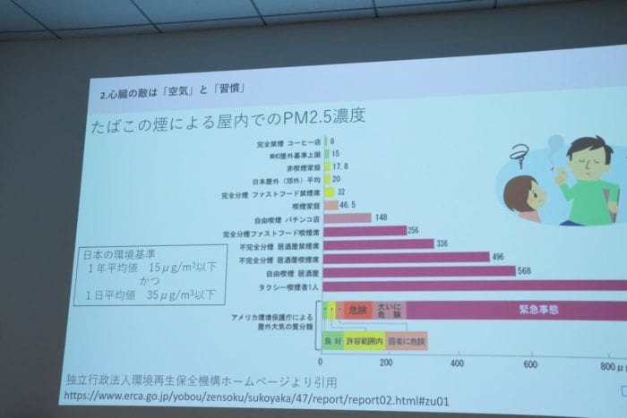 PM2.5(ブラックカーボン)による心臓疾患リスクは「主要幹線道路に近いところに住む方は心筋梗塞などを発症しやすい」という海外の調査結果や、タバコによる影響が非常に大きい点なども紹介。
