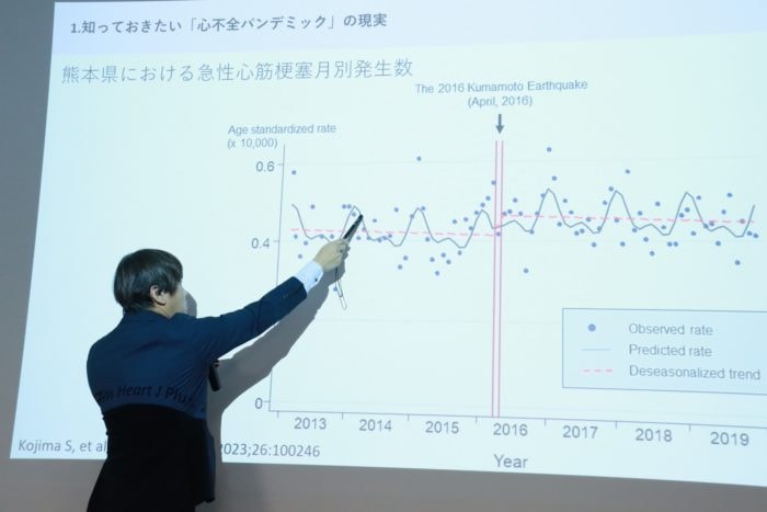 「私は臨床医なのでいつも患者さんを診ていますが、(心臓トラブルは)毎年冬場に増えます。熊本では2000年から毎年心筋梗塞の疫学調査を行っており、県内でどれくらい心筋梗塞が発症したかを把握しています。そのデータを解析したところ、冬場の発症が増加していました。春になると減り、夏は少ない傾向です。私たち(医者目線で)も、救急外来で毎日心筋梗塞や心不全の患者が搬送されてくることを実感しています。」
