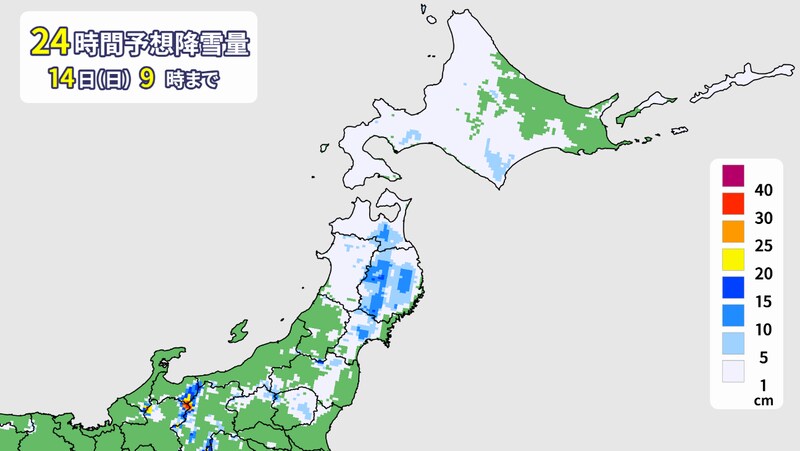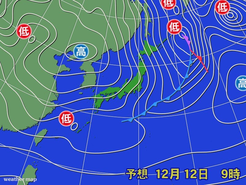 2つの低気圧は発達しながら進み、日本海側の低気圧は北海道へ、太平洋側の低気圧は三陸沖を通って千島付近へ進む見込みです。東日本や北日本では、雪や雨が降るでしょう。東北太平洋側や道東でも大雪となるところがある見込みです。