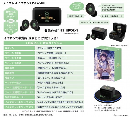 本コラボレーションモデルは、戌亥とこをイメージしたデザインを左右のイヤホンや充電ケースにあしらい、黒を基調としたシンプルで普段使いができるデザインです。また内蔵されているボイスは完全録り下ろし(全13ワード)です。パッケージには、本コラボレーションモデルのために撮り下ろされた戌亥とこのビジュアルを採用しています。