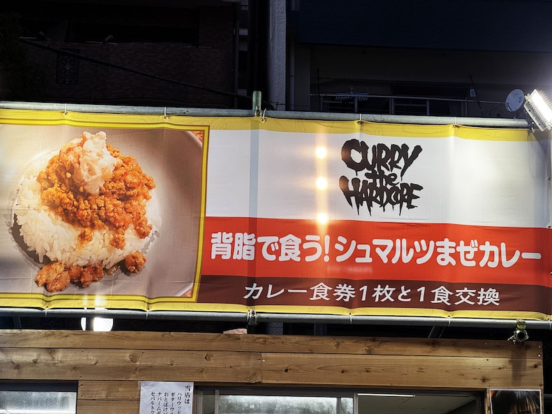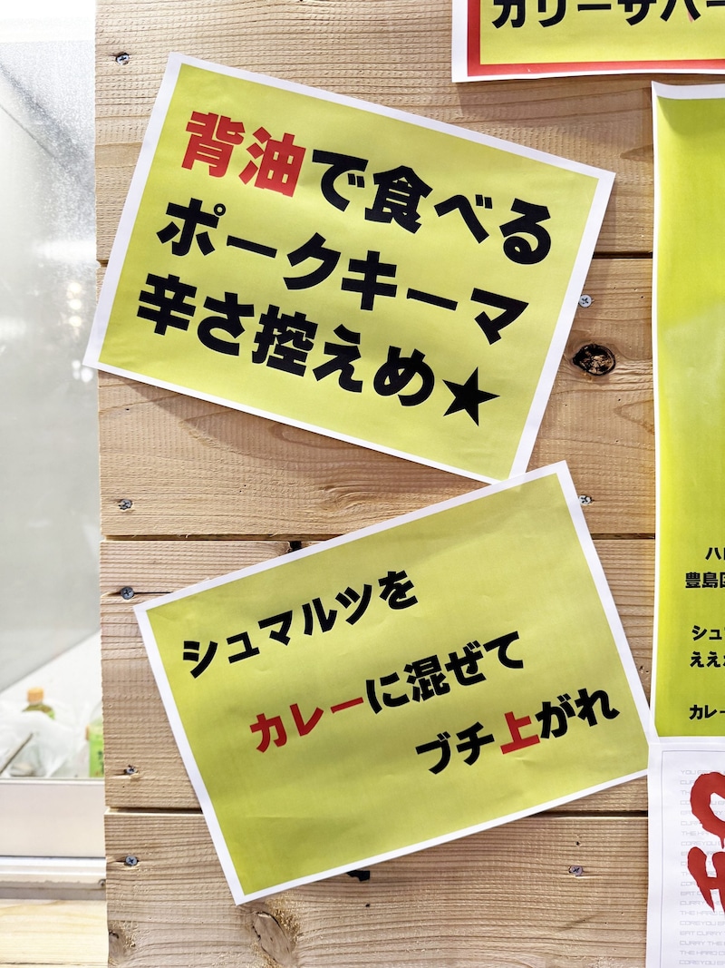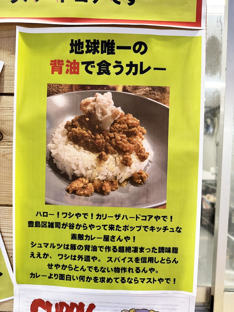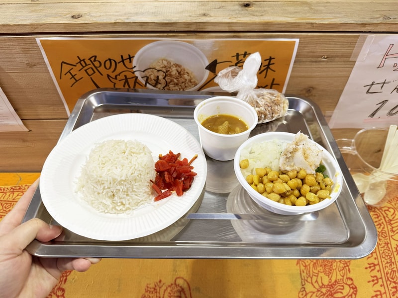 トッピング全部乗せをオーダーすると、シュマルツまぜカレーにホクホクひよこ豆が盛られた状態で渡される。それをライスにドグァーッとかけ、そこにサクサクカリカリの薬味をかけて仕上げる。ビジュ的にピラミッド状態にしたら、あとはかき混ぜつつ食べ進める。