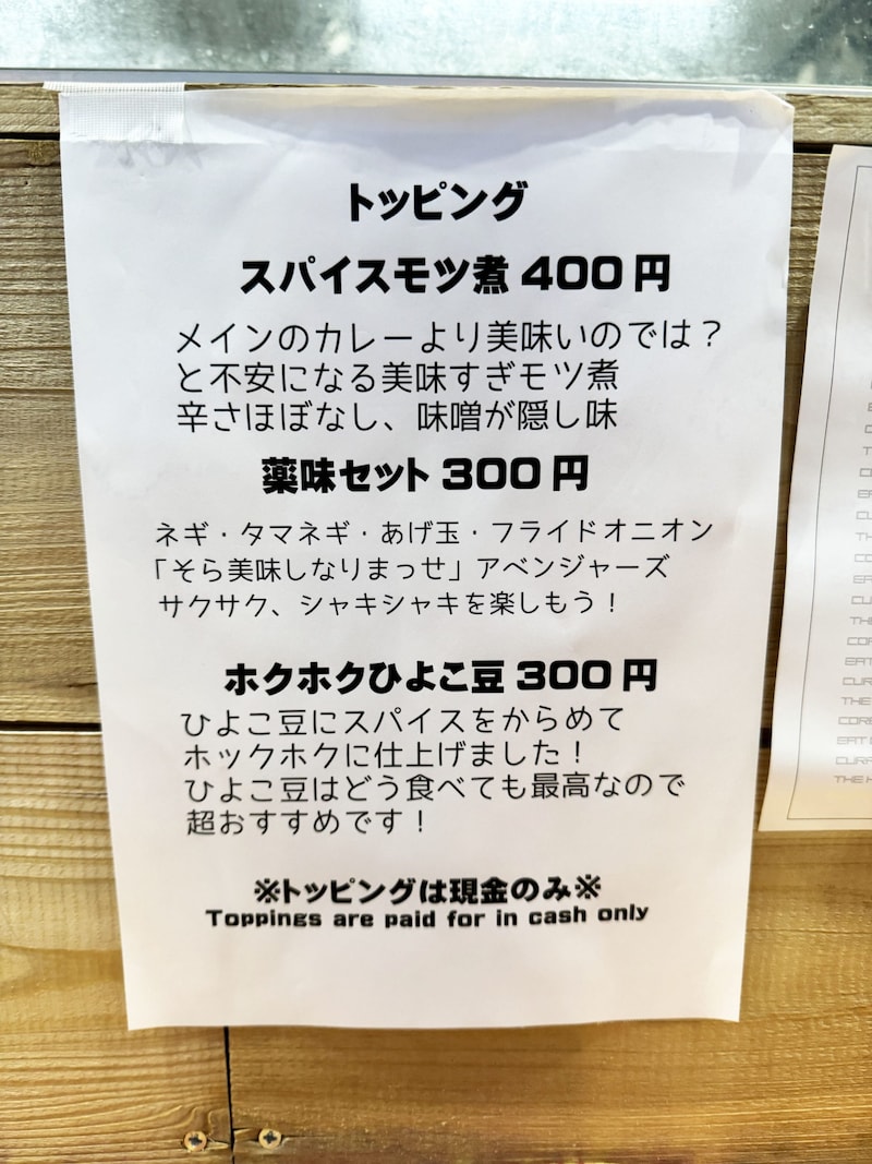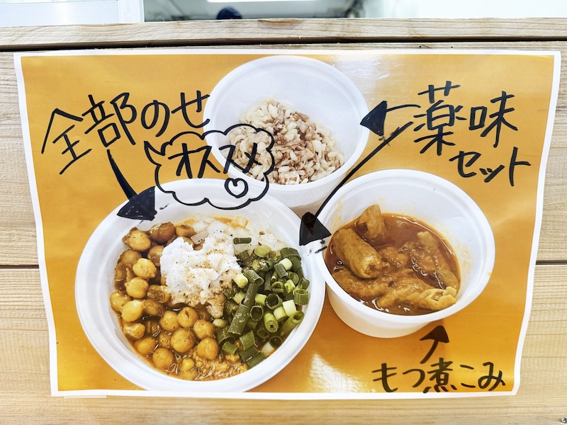 シュマルツまぜカレー、そのまま食べてもおいしいと思われるが、ここはぜひともトッピングを追加して食べたい。スパイスもつ煮、薬味セット、ホクホクひよこ豆、それらのトッピング、全部乗せである。
