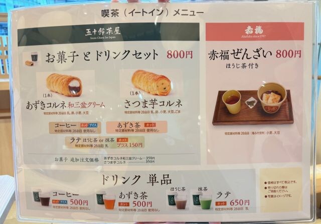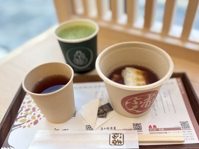 ドリンクは単品注文もOK。「あずき茶」は、北海道産あずきを香ばしく焙煎し、やさしい味わいを楽しめるノンカフェインのドリンク。「抹茶ラテ」は、赤福店舗で提供している抹茶を使用し、程よい甘みと抹茶の旨み感じる一杯。