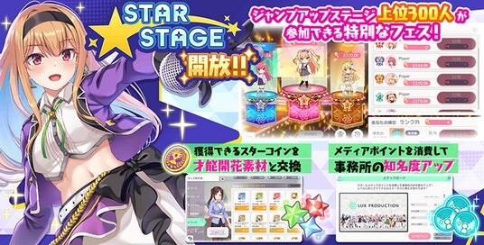 9月24日よりスターステージを新たに実装いたしました。スターステージはジャンプアップステージの最高位300名だけが挑める特別なライブです。ライブ報酬として獲得できる「スターコイン」は、ゲーム内のグッズ制作室で「才能開花」などの育成アイテムと交換することができます。