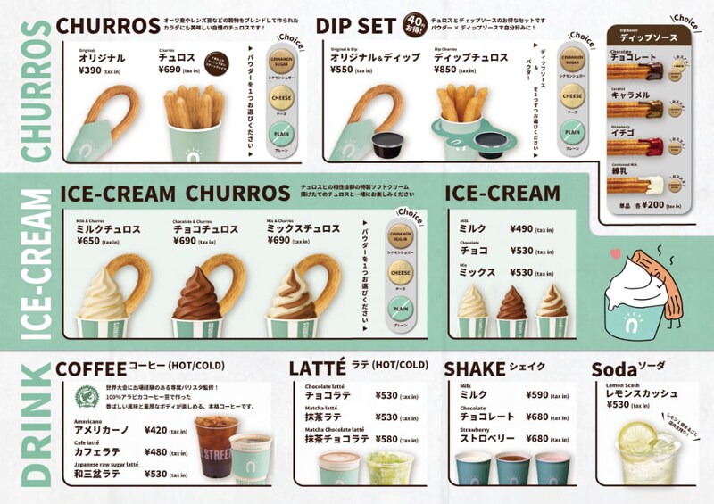 日本限定の抹茶ラテや和三盆ラテといったドリンクもラインナップ。チュロス7種、ソフトクリーム3種、ドリンク10種がそろいます。