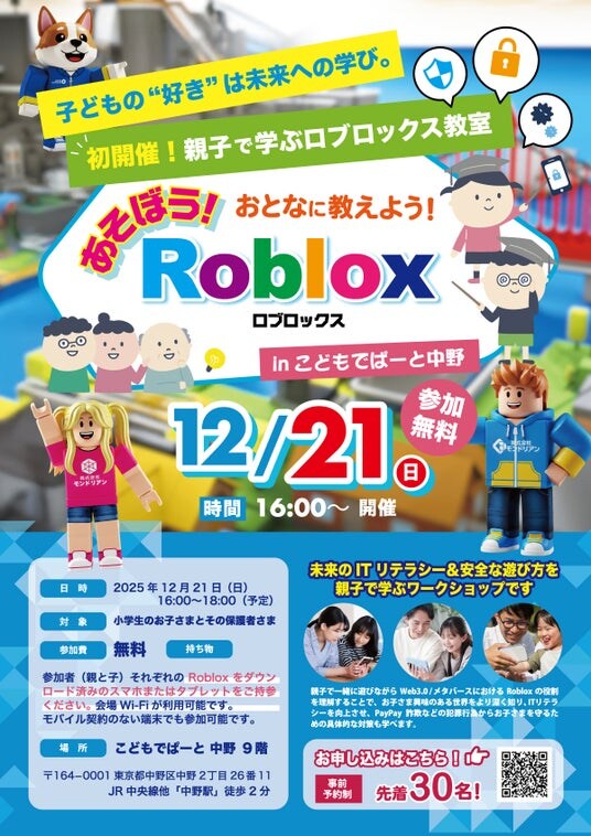 株式会社モンドリアン(本社:東京都中央区、代表取締役:角田 拓志、以下「当社」)は、オンラインゲーム「Roblox(ロブロックス)」を活用し、ITリテラシーと安全なデジタル環境について親子で学べるワークショップを開催いたします。