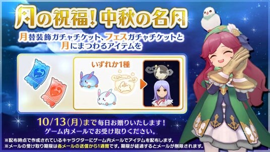 「月替装飾ガチャチケット」「フェスガチャチケット」に加え、“月”にまつわるアイテムを毎日、獲得できます。