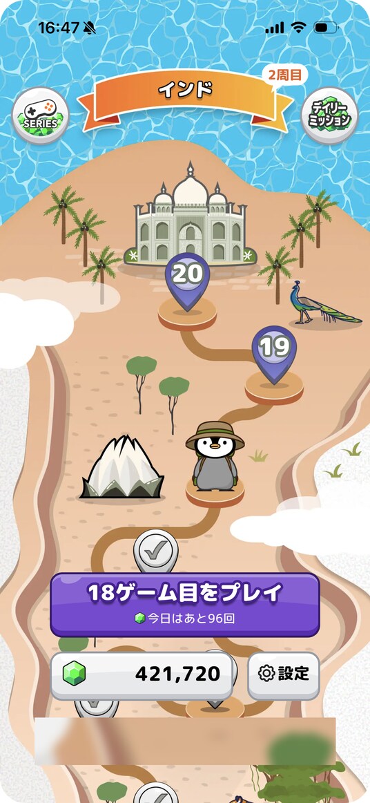 「世界旅行」をテーマにした10エリアをご用意しました。1エリアにつき10ゲームを収録し、エリア内の全ゲームをクリアすると次のエリアへ移動できます。各ステージをクリアしていくたびに、世界を巡るような達成感が味わえます。全エリアをクリアすると世界一周達成となり、2周目をスタートできます。
