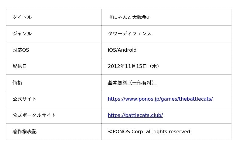 『にゃんこ大戦争』は、iOS・Android向けタワーディフェンスゲームです。プレイヤーは様々な能力を持つ「にゃんこ」たちを編成して、各地を侵略していきます。2012年のリリース以来、個性的なキャラクターや独特の世界観が、日本のみならず世界中の多くのお客様にご支持をいただいています。今後も多様なメディア展開やコラボレーションを積極的に行ってまいります。