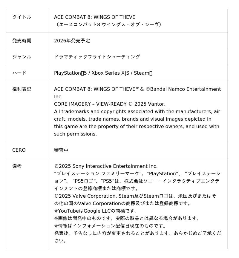 株式会社バンダイナムコエンターテインメントは、 エースコンバットシリーズ最新作『ACE COMBAT 8: WINGS OF THEVE』(エースコンバット8 ウイングス・オブ・シーヴ)をPlayStation(R)5/Xbox Series X|S/Steam(R)にて2026年に発売することをお知らせいたします。