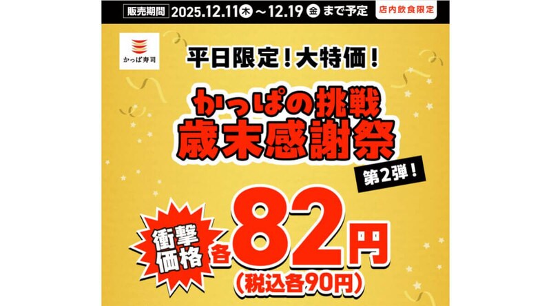 かっぱ寿司では、「かっぱの挑戦 歳末感謝祭」第2弾を開催中。