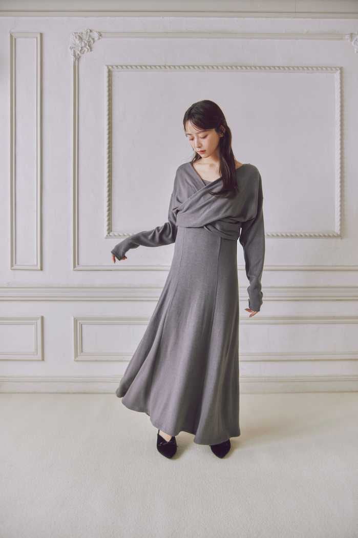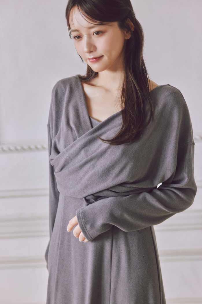 カシュクールワンピース(17,600円)は顔周りをすっきり見せ、デコルテの抜け感が女性らしさを引き立てます。