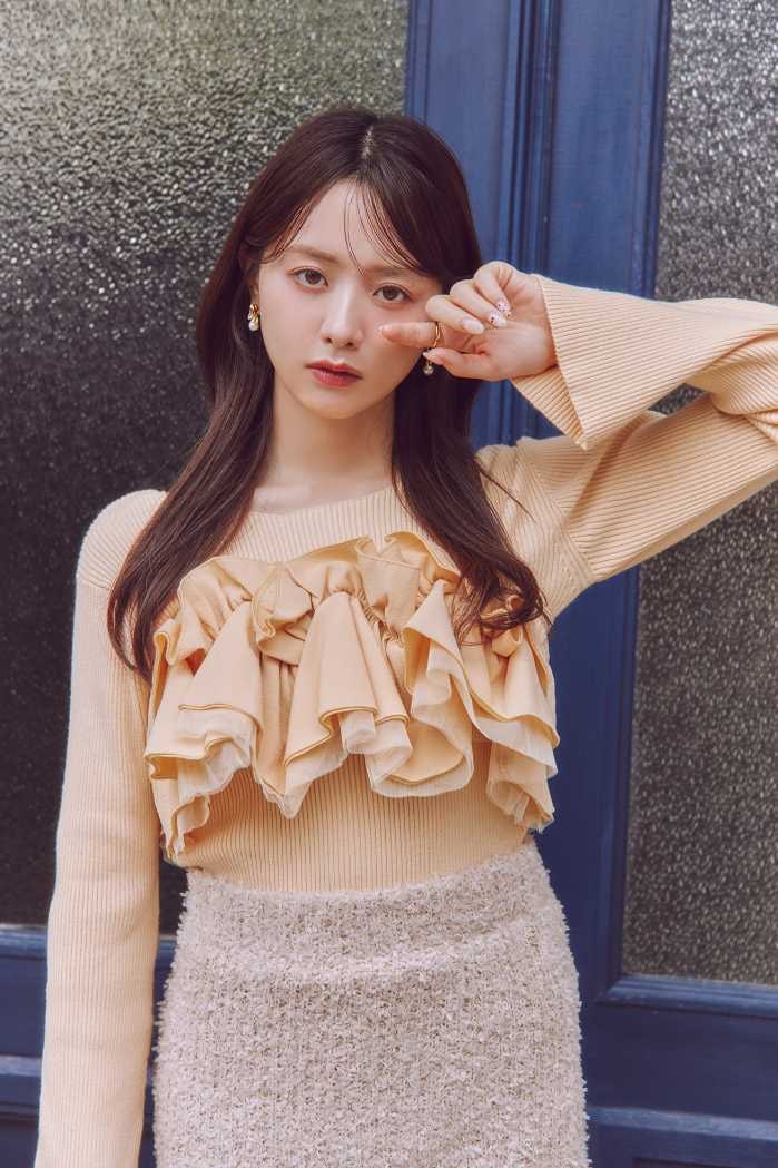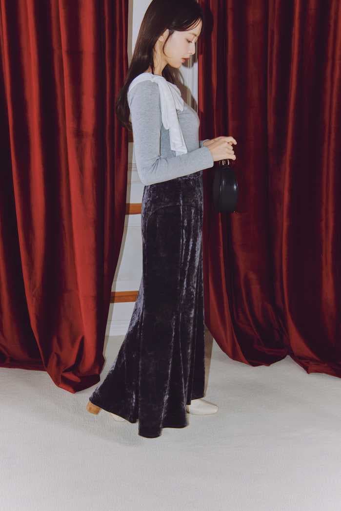 大胆なフリルが印象的なKNIT×BUSTIER SET(13,200円)とスカート(12,100円)は、都会的なムードを演出。アクセサリーを合わせるだけで華やかさが増し、シーンを選ばず活躍します。