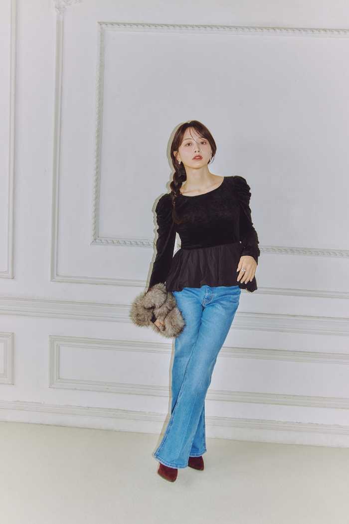 ペプラムトップス(10,450円)とパンツ(12,100円)は、デニムスタイルを簡単に格上げしてくれます。