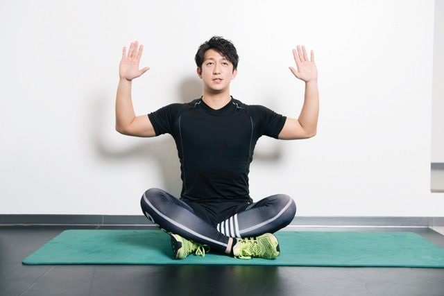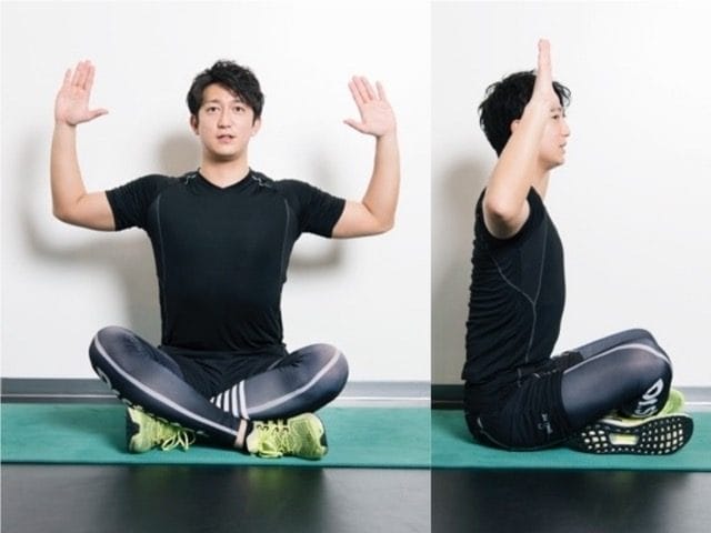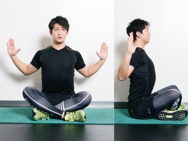(1)床にあぐらで座り、肩と水平になるように腕を上げて両ひじを直角に曲げる