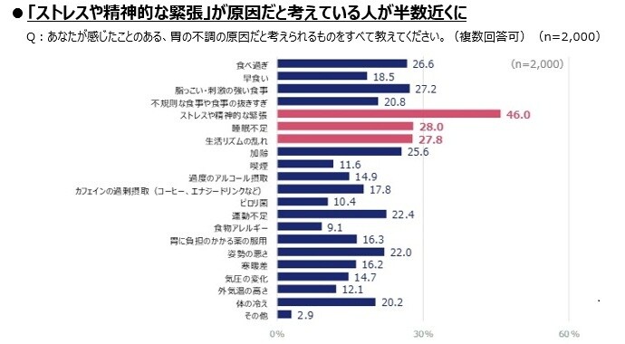 中でも「食べすぎ」「ストレス」「生活リズムの乱れ」は共通して上位に挙がり、忙しい時期ほど胃の休まる時間が少なくなることがわかります。