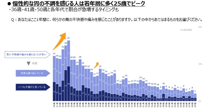 また、調査では「年齢に関係なく胃の不調が起きている」ことも示されており、特に20代後半で不調のピークが見られる傾向がありました。仕事や生活が忙しくなる年代では、ストレスや不規則な食事が重なりやすく、胃のコンディションを崩す一因となっているようです。「胃の違和感をそのままにせず、早めに生活習慣を整えることが大切です」と三輪先生は話します。