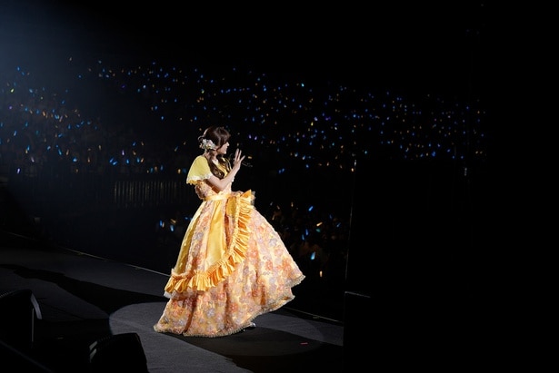風船のシルエットが様々な場所を流れ飛んでいくブリッジ映像を挟み、ライブは後半戦に突入。美しいイエローのドレスを纏った水瀬は、ステージ前に現れた紗幕に投影される映像の中、まるで深海で歌っているかのような雰囲気で「BLUE COMPASS」をあたたかく届ける。センターステージで歌われた「Starlight Museum」では、感極まって涙を流すシーンも。こみあげる感情を飲み込みながら笑顔を浮かべて歌われた「ありがとう、好きだよ!」のフレーズに、10年を共に歩んできたオーディエンスの感情も大きく震える。