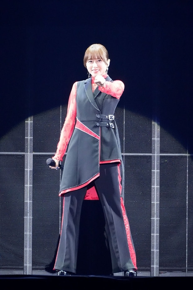 10年分の軌跡をまとめたメモリアルムービーを挟み、2度目の衣装チェンジをした水瀬が現れる。今度は黒と赤を基調としたパンツルック。そのスタイルに合わせるように「Starry Wish」「スクラップアート」といったクールな側面を打ち出す楽曲がプレイされていく。中でもカオティックなサウンドスケープの中、伸びやかで神秘的な歌を放った「NEXT DECADE」でのパフォーマンスは圧巻。10年の活動の中で手に入れた表現力の幅をしっかりと刻み付けた。