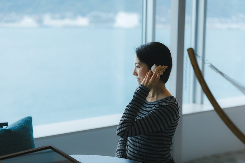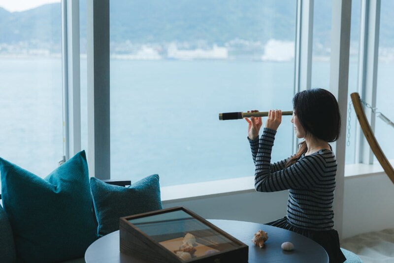 「海峡カバナスイート」のお部屋では「海峡カバナBOX」の貝殻を耳に当てて海の音を聞いてみたり、望遠鏡で往来する船を近くに感じてみたり。お部屋でくつろぎながら関門海峡を楽しむことができます。