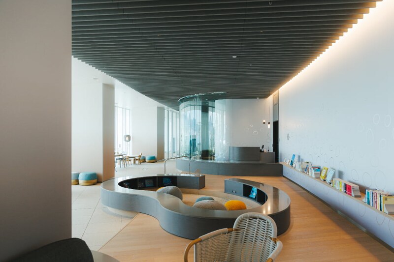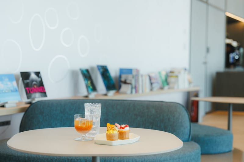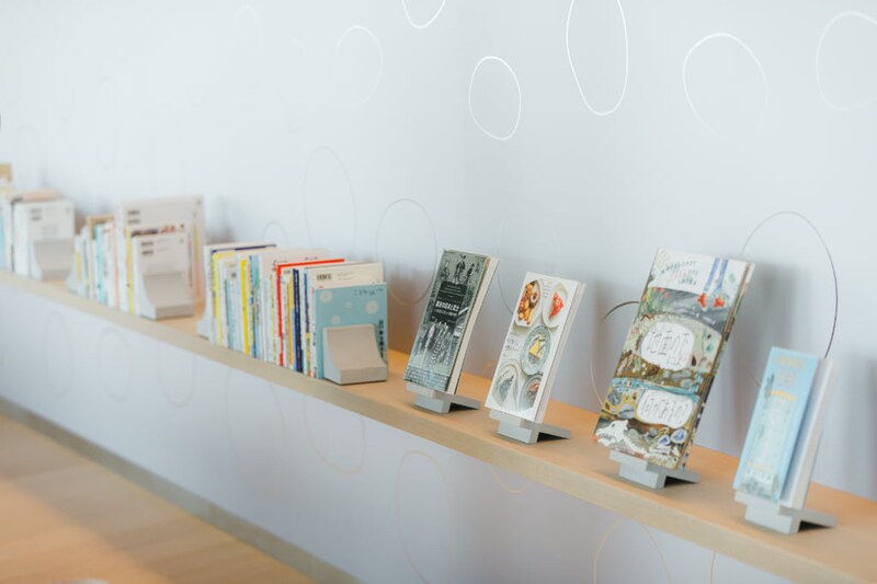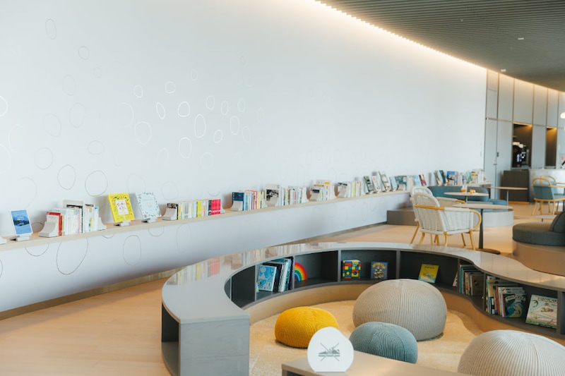 1階ロビーのくつろぎエリア「Books&Cafe」には、大人がゆっくりとめくることのできる写真集や本、子ども向けの絵本がたくさん。