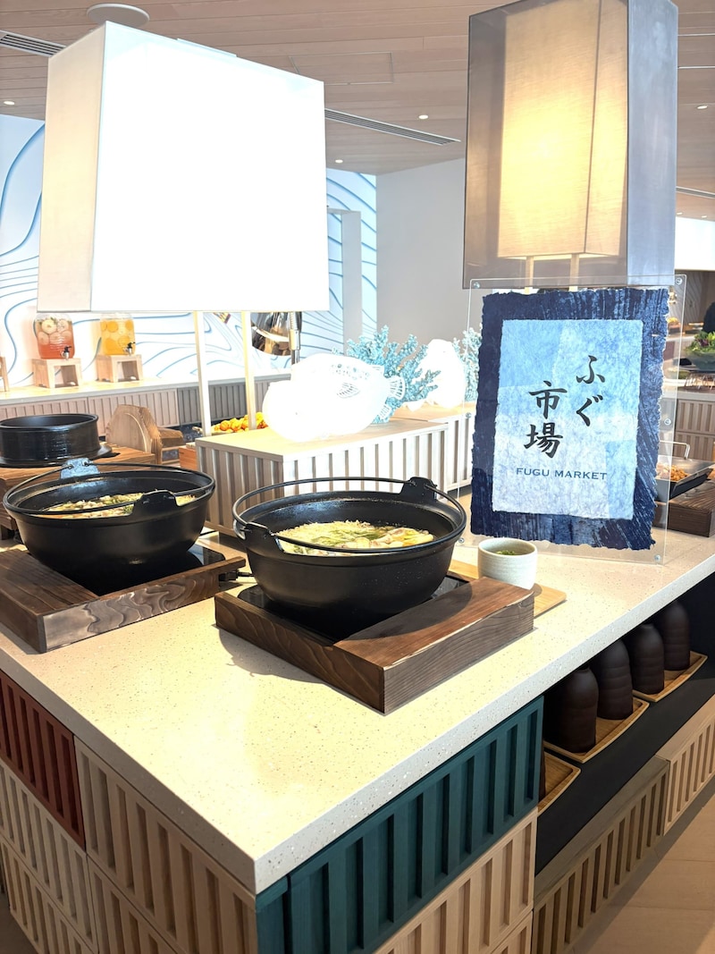 コンテナ船をイメージしたビュッフェダイニング「PUKU PUKU」は、からあげやブイヤベースなどの種類豊富なふぐ料理や、山口名物「瓦そば」に、山口県のお酒が並びます。