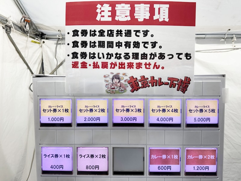 まず、絶対に忘れてはならない注意点をお伝えしたい。東京カレー万博では、現金しか使用できない。交通系決済、QRコード決済、クレジットカード、すべて使用できない。硬貨か紙幣のみ使用可能となっている。よって、現金を持たずに行くと、何も食べられない。