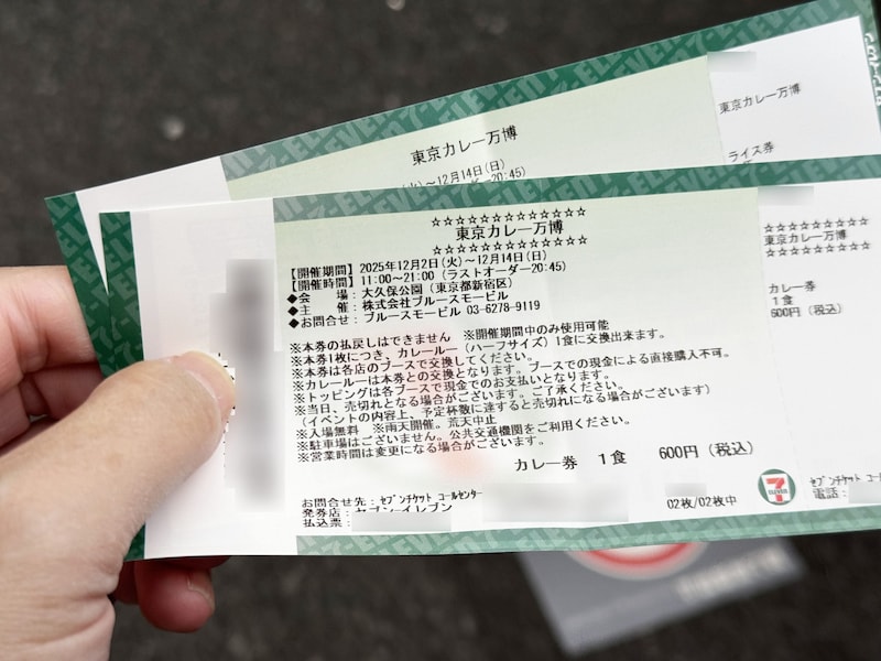 だが、唯一、現金以外で食べる手段が存在する。それは、セブンイレブンで前売りの「カレー+ライス券」(1000円)を購入するという方法だ。これを買えば、ライス1皿、カレー1杯を東京カレー万博の会場で購入することが可能だ。セブンチケットで予約し、セブンイレブンで支払いをすれば、カレー+ライス券が手に入る。