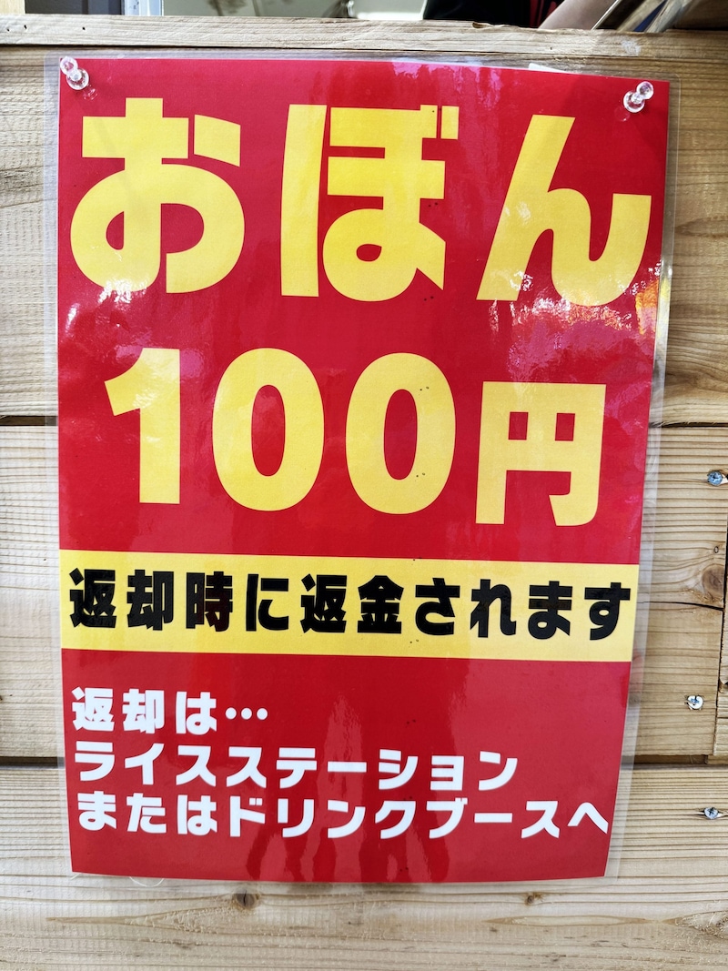 おぼんはライスブースで100円で借りることができる。あとでおぼんを返却すると、100円を返してくれる。