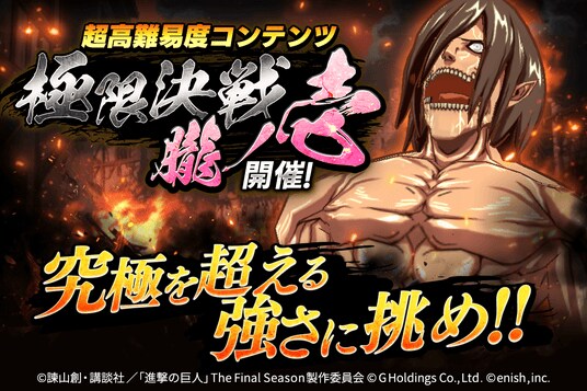 本ゲームは、単行本世界累計発行部数1.2億部を突破した人気作品『進撃の巨人』のスマートフォンゲーム最新作です。『進撃の巨人』は、NHK総合にて2023年11月4日(土)に「進撃の巨人」The Final Season完結編(後編)が放送されました。