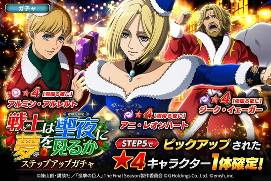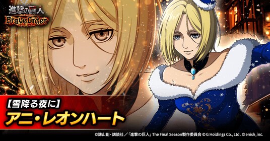 株式会社enish(本社:東京都港区、代表取締役社長:安徳 孝平、以下enish)は、アニメ『進撃の巨人』のスマートフォンゲーム最新作「進撃の巨人Brave Order」にて、2025年12月12日(金)より、新イベントの戦士は聖夜に夢を見るかを開催!また、本日より【雪降る夜に】アニ・レオンハート、【雪降る夜に】アルミン・アルレルト、【雪降る夜に】ジーク・イェーガーが登場する「戦士は聖夜に夢を見るかガチャ」も開催!その他、最新情報はゲーム公式サイト・ゲーム公式X(旧Twitter)アカウントにて随時公開して行きますので、ぜひご覧ください。