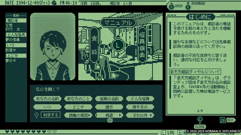 本作は、1994年の日本を舞台に、怪異専門の電話相談室の新人として【怪異】の仕業かどうかを判定するアドベンチャーゲームです。