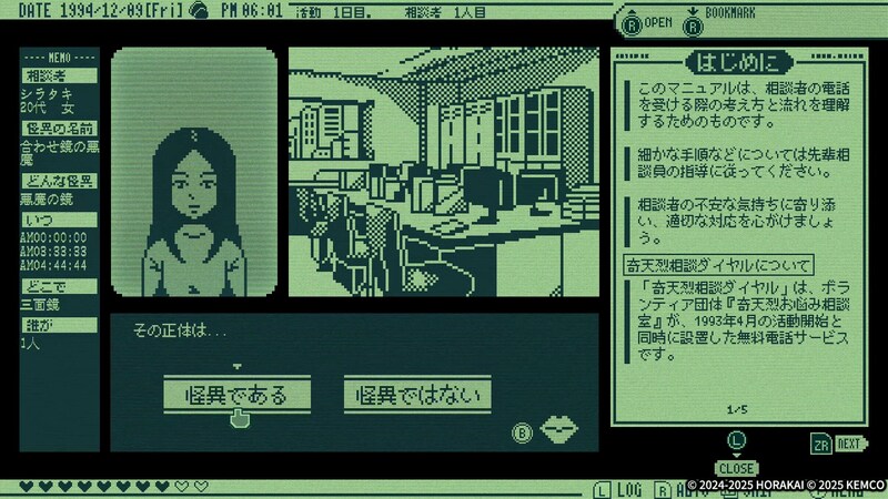本作は、1994年の日本を舞台に、怪異専門の電話相談室の新人として【怪異】の仕業かどうかを判定するアドベンチャーゲームです。