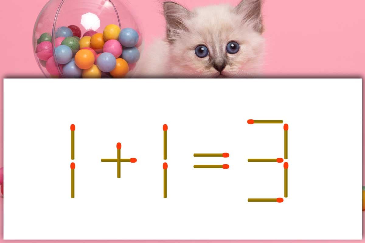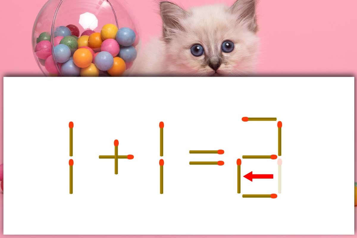 答えの「3」から、右下にある縦のマッチ棒を取ります。そのまま左にスライド! すると、数字が「2」に早変わり。無事「1+1=2」の式が成立しました。