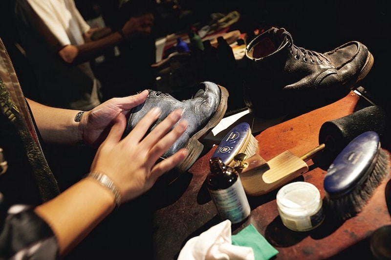 10人の靴磨き職人が集結し、その場でブーツや革靴を磨いてくれた(有料)。靴磨きコンテストも開催され、技の競演も。磨いてもらった靴は撮影もできたぞ。