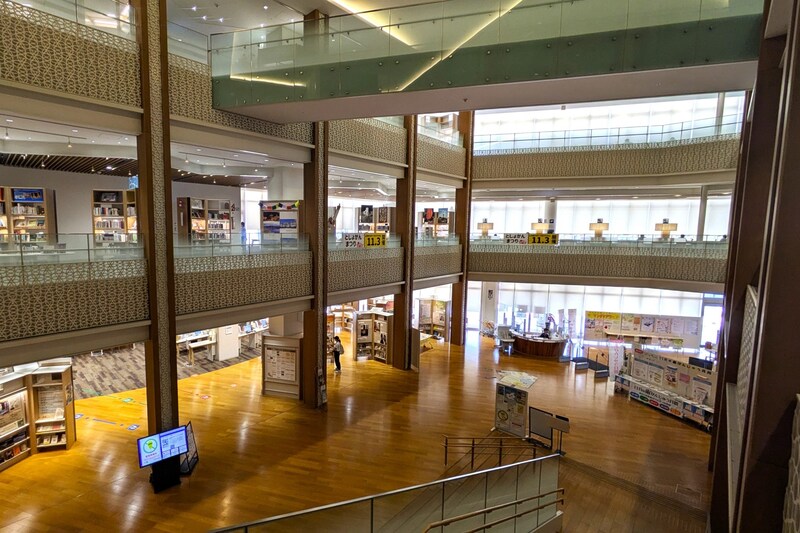 大きなガラスの吹き抜けから光が差し込み、だれでも気軽に過ごせる、明るく開かれた図書館として親しまれています。