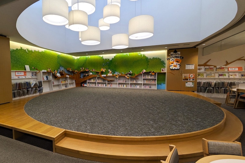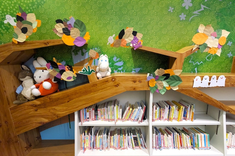 大樹と、上空には雲を思わせるペンダント照明が飾られたスペース「おはなしの森」では、赤ちゃん向けに絵本・紙芝居などの読み聞かせを定期的に開催。
